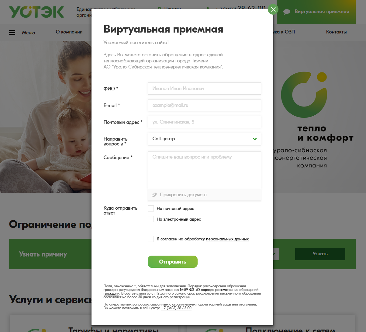 В адрес теплоснабжающей организации еженедельно поступают обращения от потребителей, по почте, по телефону потребители высказывают свои претензии и пожелания. Для приема обращений с сайта была разработана виртуальная приемная, в которой можно выбрать структуру, куда потребитель хочет направить обращение.