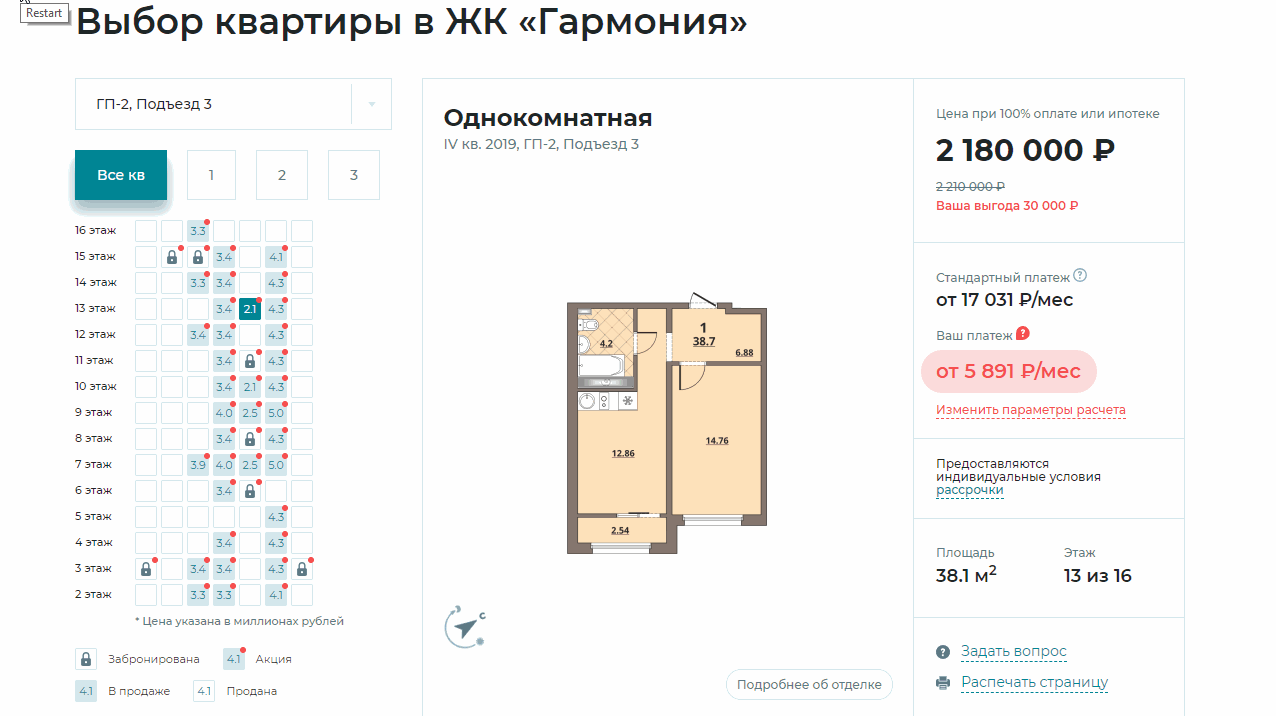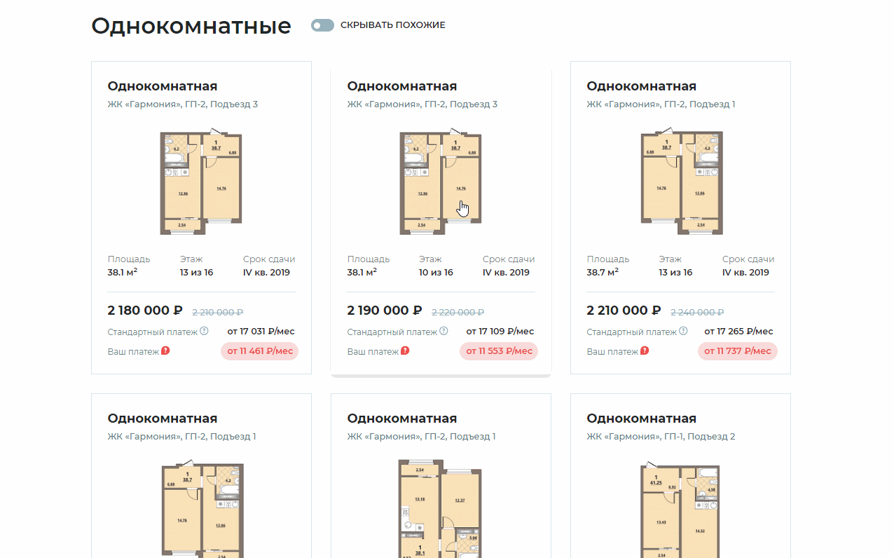 Данные о первоначальном взносе сервиса сохраняются в cookie-файлах у пользователя. Это значит, что ежемесячный платеж будет автоматически рассчитываться на основе сохраненного первоначального взноса для всех квартир на сайте.