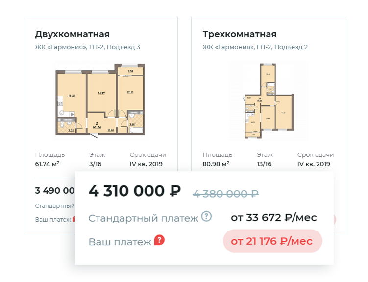 Сервис позволяет отобразить пользователю сайта его персональный ежемесячный платеж, рассчитанный на основе большего первоначального взноса, чем при стандартных условиях ипотечного кредитования.
