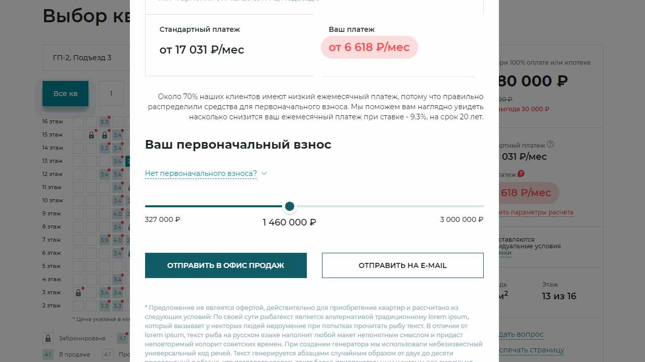 Когда пользователь определился с квартирой и первоначальным взносом, он может сохранить расчеты, отправив их себе на E-mail или же прямо в офис продаж застройщика.