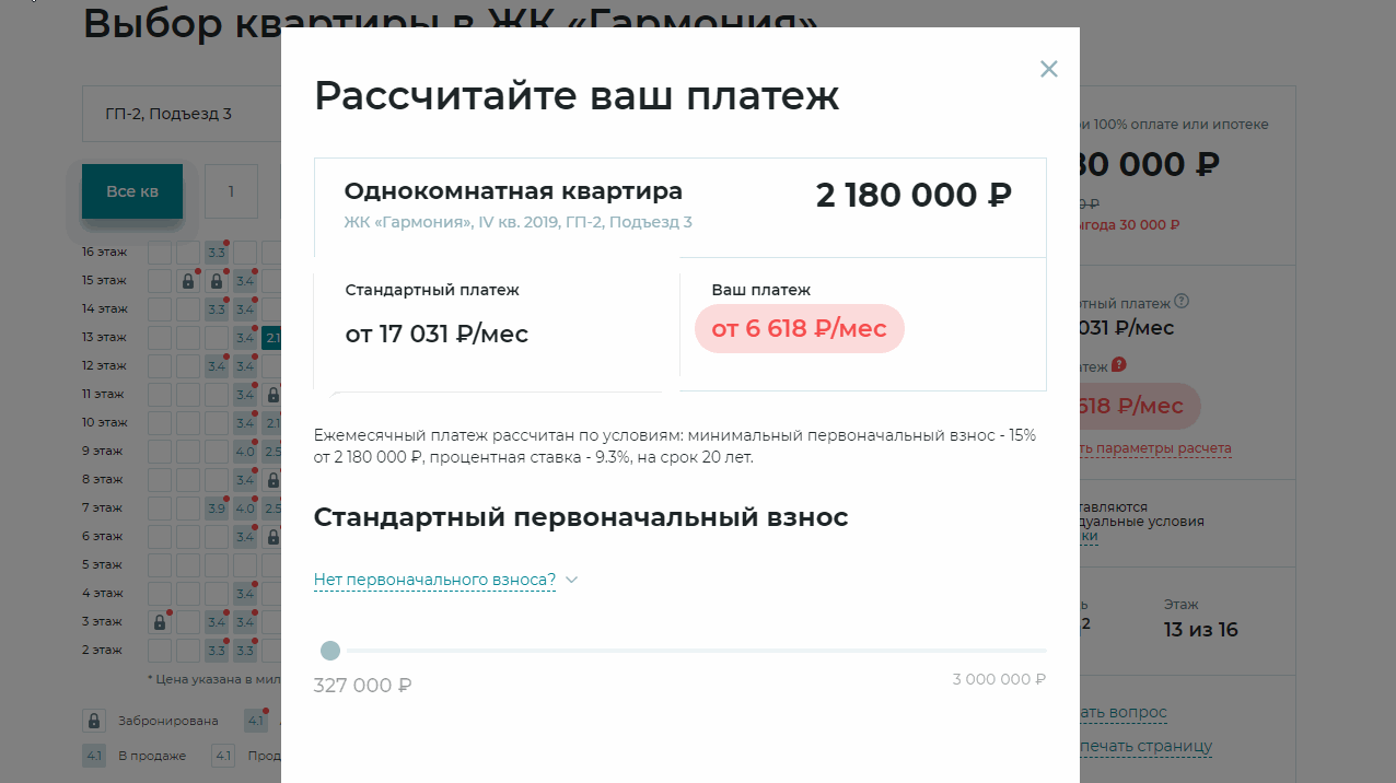 Он наглядно показывает, насколько снизится ежемесячный платеж, если покупатель увеличит свой первоначальный взнос.